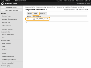 Chcete-li certifikát CA smazat, vyberte ten, který chcete smazat, a klikněte na [Smazat]