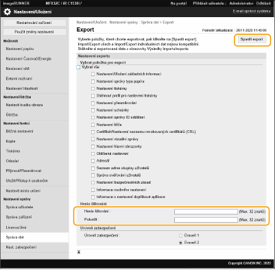 Heslo zadané v [Heslo šifrování] bude vyžadováno při importu exportovaných dat nastavení. Použijte alfanumerické znaky.