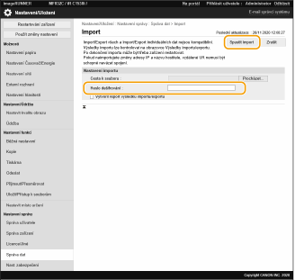 Při importu nastavení správy ID oddělení do jiné multifunkční tiskárny se zapnutou správou ID oddělení se přepíší informace správce systému, takže se může stát, že nebudete moci provést přihlášení s pomocí předchozího ID a kódu PIN správce systému. Před provedením této operace v každém případě zkontrolujte informace správce systému uložené na exportujícím stroji.