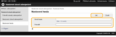 Zadejte aktuální heslo v [Původní heslo:] a klikněte na [OK] bez zadání hodnoty pro [Nové heslo:] nebo [Potvrdit:] (ponechte je prázdné). Jestliže byl v [Zásady pro nastavení hesla] nastaven limit pro zadávání znaků, pro toto nastavení musí být zadána hodnota. Zrušte tento limit před odstraněním hesla.