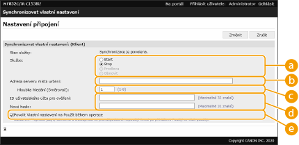 Stiskněte (Nastav./Uložit) <Nastavení správy> <Správa zařízení> nastavte <Synchronizovat vlastní nastavení: (Klient)> na <Umožnit>.Jako způsob ověření musí být nastaveno ověření uživatele.