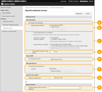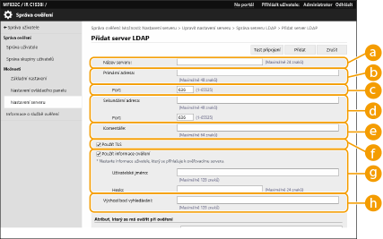 Zadejte číslo portu používaného ke komunikaci se serverem LDAP. Použijte stejné nastavení, které je zadané na serveru. Jestliže číslo nezadáte, automaticky se nastaví na „636“, když je zaškrtnuté políčko [Použít TLS], nebo se nastaví na „389“, když políčko zaškrtnuté není.