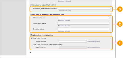 Vyberte, jak nastavit jméno domény místa určení pro přihlášení. Chcete-li zadat jméno domény přímo, vyberte [Zadat název domény] a zadejte jméno domény. Chcete-li zadat datové pole LDAP (název atributu), z něhož se má získat jméno domény na serveru LDAP, vyberte [Zadat název atributu pro získání jména domény] a zadejte název atributu (Příklad: dc).