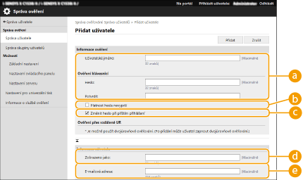 Pokud uživatelské jméno a heslo nesplňuje výše uvedené podmínky, ID oddělení bude přiřazeno automaticky s tím, že bude začínat od 0000001 a 0 (žádné) bude nastaveno pro PIN.