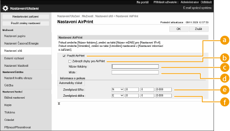 Pokud se přihlásíte s právy administrátora, můžete nastavení služby AirPrint měnit také z obrazovky služby AirPrint.