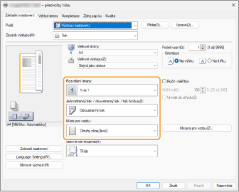 Při kontrole náhledu tisku nastavte [Rozvržení strany] [Pořadí stránek] [Jednostranný tisk / oboustranný tisk / tisk brožury] [Místo pro vazbu].