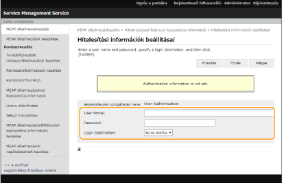 Ha módosította a bejelentkezési alkalmazást, erősítse meg újra a hitelesítési adatokat a [MEAP hitelesítés beállítás] menüpontban. Elképzelhető, hogy újra meg kell adnia a hitelesítési adatokat.