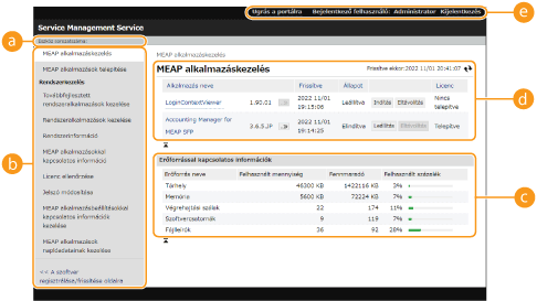 A MEAP-alkalmazás beállításaival kapcsolatos információk megjelenítésére és törlésére szolgál. Ha vannak olyan beállítási adatok, amelyek több alkalmazásra is érvényesek, akkor megjelenik az [Shared Setting Information of Applications] elem is. Ez más elemekhez hasonló módon törölhető.