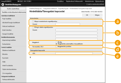 Az üzenet megjelenítésének megszüntetéseTörölje az [Állapot mutatásának engedélyezése], [Előugró ablak engedélyezése] és [Távvezérlés, RUI] lehetőségekhez tartozó jelölőnégyzetek bejelölését. Ha az üzenet tartalmát is törölni szeretné, a [Üzenet] szövegmezőkbe beírt szöveget is távolítsa el.