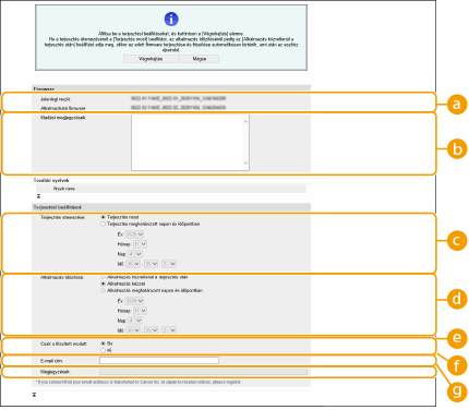 Ha a készülék kapcsolódik az internethez, akkor a készülékhez tartozó legújabb firmware-t a Canon terjesztési kiszolgálójáról is letöltheti. Ez a frissítési mód rugalmasabb és kényelmesebb lehet, mint a másik (A firmware frissítése), mivel itt kézi és automatikus frissítésre is lehetőség van, így megteheti, hogy a frissítést adott időpontban tölti le, vagy amint a legújabb verzió elérhetővé válik. Ezeknek a műveleteknek a végrehajtásához rendszergazdai jogosultságok szükségesek.