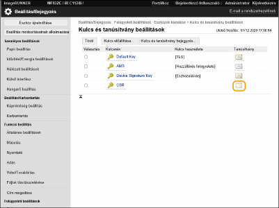 A készüléken előállított tanúsítványok nincsenek CA aláírással ellátva, ami egyes kommunikációs partnerek esetében kommunikációs hibákat okozhat. CA aláírással ellátott tanúsítvány igényléséhez tanúsítvány-aláírási kéréshez (CSR) kapcsolódó adatok szükségesek. CSR-t rendszergazdai jogosultságokkal bejelentkező felhasználók állíthatnak elő.