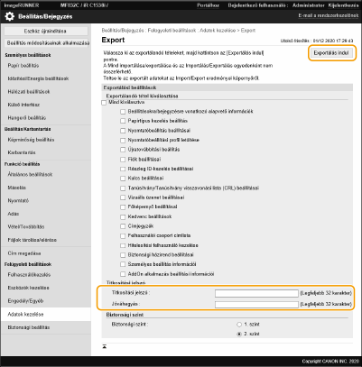 Az összes beállítási adat titkosításához válassza a [2. szint] lehetőséget a [Biztonsági szint] menüpontban.