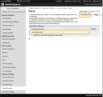 A készülékről az összes beállítási adatot exportálhatja és számítógépre mentheti, majd amikor egy új készüléken adja meg a beállításokat – például amikor cserekészüléket vásárol – importálhatja őket. Ha kettő vagy több Canon többfunkciós nyomtatón ugyanazokat a beállításokat szeretné megadni*, megteheti, hogy egyszerűen exportálja az összes beállítást az egyik készülékről, majd importálja őket a többire, így nem kell mindegyik készüléket egyesével beállítania. Ezeknek a műveleteknek a végrehajtásához Rendszergazda jogosultságokkal jelentkezzen be a Távvezérlésbe.