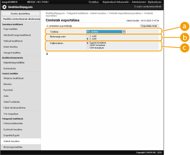 Az exportálandó adatok fájlformátumát választhatja ki. Ha a címlistákba bejegyzett összes információt egy másik Canon többfunkciós nyomtatóra fogja importálni, válassza a [Egyéni formátum] lehetőséget, ha pedig a fájlt számítógépes alkalmazásban szeretné használni, válassza az [LDAP formátum] vagy [CSV formátum] lehetőséget. Ügyeljen rá azonban, hogy az [LDAP formátum] kiválasztása esetében a készülék csak az e-mail-címeket és a faxszámokat menti.