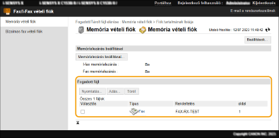 A fogadáskor részekre osztott I-faxok ellenőrzéseA fogadáskor részekre osztott I-faxok listájának megjelenítéséhez a 3. lépésben megjelenő képernyőn kattintson a [Osztott adat vételi fiók] lehetőségre. I-faxok fogadása