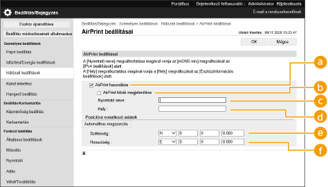 Ha rendszergazdai jogosultsággal jelentkezik be, akkor az AirPrint beállításait az AirPrint oldaláról is módosíthatja.