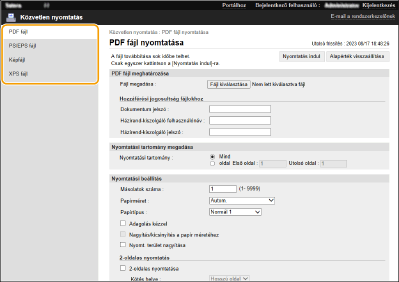 Ha a PDF-fájlhoz jelszó van beállítva, akkor nyomja meg a [PDF fájl meghatározása]  gombot, majd a [Dokumentum jelszó] mezőben adja meg a jelszót. Házirend-kiszolgálóhoz kapcsolódó PDF-fájlok nyomtatása esetében válassza a [PDF fájl meghatározása]  elemet, a [Házirend-kiszolgáló felhasználónév] mezőben adja meg a házirend-kiszolgálón regisztrált felhasználónevet, a [Házirend-kiszolgáló jelszó] mezőben pedig adja meg a jelszót.
