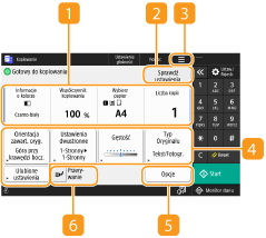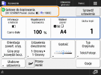 Wyświetla status ustawień, takich jak proporcja kopiowania, format papieru i liczba kopii. Upewnij się, że potwierdzono ustawienia, aby rozpocząć prawidłowy proces kopiowania. Aby zmienić ustawienie, należy wybrać żądany element ustawień.