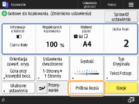 W zależności od liczby kopii i ustawień, <Próbna Kopia> jest wyświetlane, aby sprawdzić wyniki kopiowania poprzez wykonanie próbnej kopii. Sprawdzanie wyników kopiowania