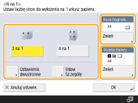 Aby wykonywać dwustronne kopie albo skanować dwustronne oryginały w celu uzyskania jednostronnych kopii, naciśnij opcję <Ustawienia dwustronne>. Aby uzyskać więcej informacji na temat tego ustawienia, patrz 2-stronne kopiowanie w punkcie 4 dla