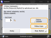 Naciśnij na <Zmiana ustawień>, aby zmienić ustawienia. <Próbna Kopia> jest wyświetlane po zmianie ustawień. Wykonaj próbną kopię ponownie.