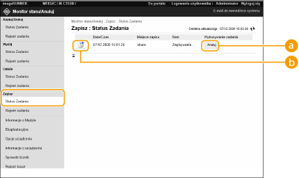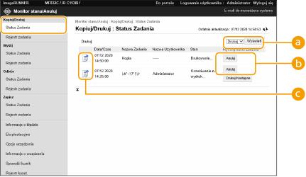 Możesz skorzystać z interfejsu Remote UI (Zdalny interfejs użytkownika), aby sprawdzić status dokumentów oczekujących na przetwarzanie oraz rejestry dokumentów, które już zostały przetworzone. Możesz również sprawdzić status urządzenia, taki jak informacje o błędach i pozostała ilość materiałów eksploatacyjnych.