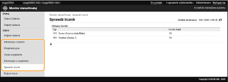 Możesz sprawdzić szereg informacji na temat urządzenia, na przykład informacje o błędach, ilość pozostałego papieru i tonera, informacje na temat dołączonego wyposażenia opcjonalnego oraz całkowitą ilość wydrukowanych stron.