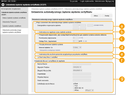 Te ustawienia nie mogą być modyfikowane, jeżeli wybrano ustawienie [Włącz czasomierz dla automatycznego żądania wydania certyfikatu]. Wysyłanie żądania wystawienia certyfikatu o określonej godzinie