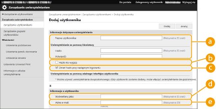 Jeśli nazwa użytkownika jest numeryczna i składa się z siedmiu cyfr lub mniej, ten sam numer jest przypisywany do tego samego użytkownika jako identyfikator wydziału. Jeśli hasło tego samego użytkownika jest zarejestrowane jako numer, który składa się z siedmiu cyfr lub mniej, jest ono również ustawiane jako kod PIN dla tego identyfikatora wydziału.