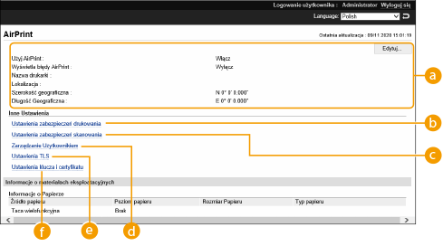 Po zalogowaniu się z uprawnieniami administratora możesz także zmienić ustawienia technologii AirPrint z poziomu ekranu funkcji AirPrint.