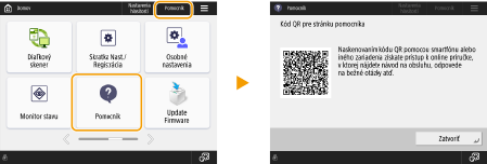 Po stlačení tlačidla <Pomocník> sa zobrazí kód QR. Naskenovaním tohto kódu QR pomocou mobilného zariadenia, napríklad smartfónu alebo tabletu, získate prístup na stránku Užívateľská príručka pre toto zariadenie.