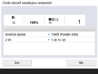 Ak vyberiete možnosť <Zap.> pre obe položky <Zobraziť potvrdzovacie okno pri obnove> a <Spustiť operáciu pre obnovu (Operácia sa spustí po stlačení tlačidla.)>, kopírovanie sa spustí, keď vyberiete možnosť <Áno> na obrazovke potvrdenia.