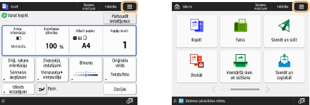 (Sākums). Ekrānā <Sākums> tiek parādīts funkciju pogu un darbību saraksts, no kura var piekļūt dažādām funkcijām. Ekrānā <Sākums> parādītie vienumi
