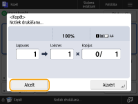 (Pārtraukt) kamēr tiek parādīts kopēšanas pamatfunkciju ekrāns, kopēšanas uzdevums tiek pauzēts, un tiek parādīts ziņojums <STOPAtlasiet kopēšanas darbu, ko vēlaties atcelt.> un kopēšanas uzdevumu saraksts. Sarakstā varat izvēlēties kopēšanas uzdevumu un atcelt to, nospiežot <Atcelt>.Ja piesakāties iekārtā, izmantojot personu autentifikācijas pārvaldību, un atsakāties no iekārtas pēc tam, kad vadības panelī esat nospiedis