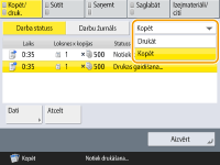 (Pārtraukt), kamēr kopēšanas uzdevumi gaida apstrādi, visi kopēšanas uzdevumi tiek pauzēti, un pēc tam tiek parādīts ziņojums <STOPAtlasiet kopēšanas darbu, ko vēlaties atcelt.> un kopēšanas uzdevumu saraksts. Sarakstā varat izvēlēties kopēšanas uzdevumu un atcelt to, nospiežot <Atcelt>. Ja vēlaties atsākt kopēšanu, nospiediet <Atsākt kopēš.>. |