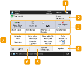 Parāda iestatījumu statusu, piemēram, izšķirtspēju un skenēšanas formātu. Pārliecinieties, vai iestatījumi ir apstiprināti, lai skenētu pareizi. Lai mainītu iestatījumus, nospiediet pogu zem ekrāna daļas. Informāciju par iestatījumiem skatiet sadaļā