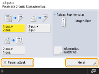 Rodoma nustatymo būsena, pvz., kopijavimo mastelis, kopijavimo popierius ir kopijų skaičius. Jei norite pakeisti parametrą, pasirinkite reikiamą parametro elementą.