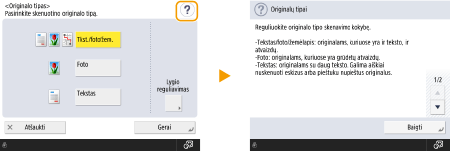 Taip pat rodomi tokie mygtukai, kaip <Atšaukti>, skirtas atšaukti parametrą ir grįžti į ankstesnį ekraną, <Toliau>, skirtas pritaikyti parametrą ir pereiti į kitą ekraną, <Atgal>, skirtas grįžti į ankstesnį parametro ekraną, ir <Uždaryti>, skirtas uždaryti tuo metu atidarytą ekraną.