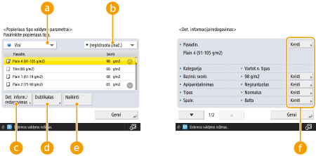 Registruodami pasirinktinio popieriaus tipo parametrus, būtinai pakeiskite jo pavadinimą. Negalite keisti aparate užregistruotų numatytųjų popieriaus tipų parametrų.