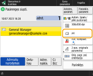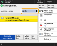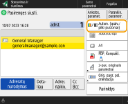 Norėdami, baigę nuskaitymą, pasirinkti adresatą ekrane <Vieno paspaud.>, nustatykite parinkties <Numatytasis ekranas> reikšmę <Vieno paspaudim.>. Norint siųsti nuskenuotus dokumentus tam pačiam adresatui, tam reikalingą darbą galima sumažinti. <Numatytasis ekranas>
