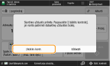 Kai reikšmė <Pranešimo rodymas priėmus užduotį> nustatyta kaip <Įjungt.>, <Būkl. kontrolė> ekranas gali būti rodomas kitame ekrane, kuris rodomas gavus siuntimo užduotį. <Pranešimo rodymas priėmus užduotį>
