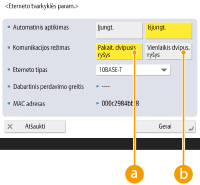 Pasirinkite <10BASE-T>, <100BASE-TX> ar <1000BASE-T> dalyje <Eterneto tipas>.