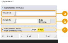 Pavyzdys: Jei „Windows“ domeno vardas yra „pavyzdys“, o „Windows“ vartotojo vardas „vartotojas1“, įveskite „pavyzdys \ vartotojas1“. Kai naudojate „Lotus Notes Domino“, įveskite autentifikuoto naudotojo identifikavimo pavadinimą (dn), pavyzdžiui, „cn=user1,ou=team1,ou=salesdept,o=canon“.