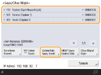 Her bir MEAP'nin sayaç bilgisini de kontrol edebilirsiniz. 2. adımdaki ekranda <MEAP Saycn Kontrol Edin> seçeneğine basın. Aynı ekranda <Cihaz Bilgisi/Diğer> <Aygıt Yapılandırma> öğelerine basarsanız makinedeki yüklü seçenekleri kontrol edebilirsiniz.