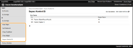 Hata bilgileri, kalan kağıt ve toner miktarı, takılı isteğe bağlı ekipmanlarla ilgili bilgi ve şimdiye kadar yazdırılan toplam sayfa sayısı gibi makine hakkındaki çeşitli bilgileri denetleyebilirsiniz.