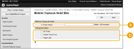 [Cihaz Yönetimi] [E-Posta Bildirim Ayarları]  [Bildirim Yapılacak Hedefi Ekleyin] seçeneğine tıklayın.