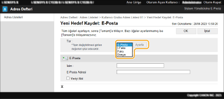 Hedefin kaydedileceği adres listesine tıklayın ([Kişisel Adres Listesi], Kullanıcı Grubu Adres Listeleri, [Adres Listesi 01] - [Adres Listesi 10] veya [Yöneticiler için Adres Listesi]).