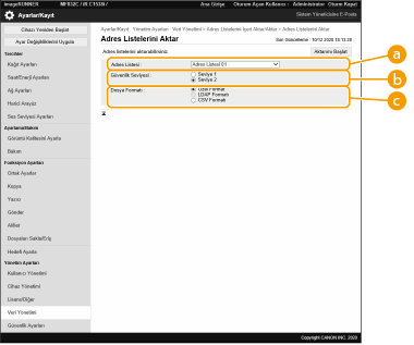 [Dosya Formatı] menüsünde [Özel Format] seçeneği belirlenirse güvenlik düzeyini ayarlayabilirsiniz. [Seviye 1] seçildiğinde tüm Canon çok fonksiyonlu yazıcılarına aktarabilirsiniz. [Seviye 2] seçildiğinde adres listesi verilerinin parolası [Seviye 1]’den daha güvenli bir yöntem kullanılarak şifrelenir. Ancak, veriler yalnızca [Seviye 2] ayarını destekleyen makineye alınabilir ([Güvenlik Seviyesi] ayarının gösterildiği modeller).