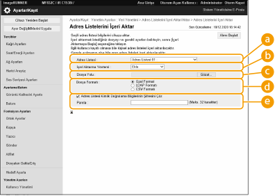 Aktarılacak verilerin dosya biçimini seçin. Adres listelerinde kayıtlı tüm bilgileri başka bir Canon çok fonksiyonlu yazıcısına almayı istediğinizde [Özel Format] seçeneğini belirleyin veya dosya bir bilgisayar uygulaması tarafından kullanılacaksa [LDAP Formatı] ya da [CSV Formatı] seçeneğini belirleyin. Ancak, [LDAP Formatı] seçilirse yalnızca e-posta adreslerinin ve faks numaralarının kaydedildiğini unutmayın.