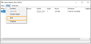 İptal edilecek belgeyi bulamıyorsanız, belge çoktan makineye gönderilmiştir. Bu durumda, yazdırmayı bilgisayarda iptal edemezsiniz.